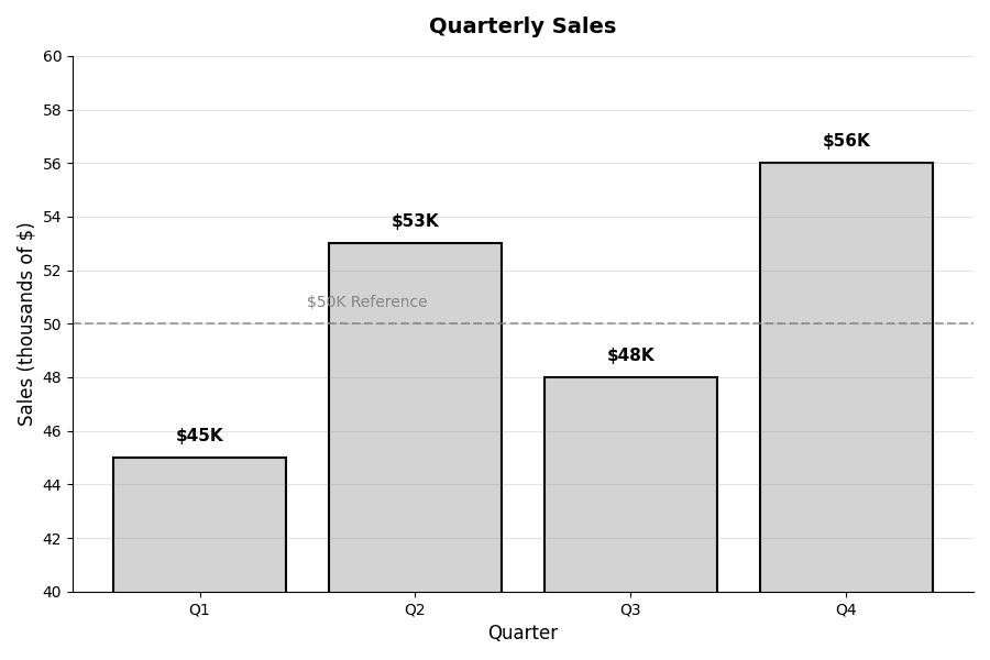 Explanation: Calculate the distance (absolute difference) from $50K for each quarter: Q1: |45,000 – 50,000| = 5,000. Q2: |53,000 – 50,000| = 3,000. Q3: |48,000 – 50,000| = 2,000. Q4: |56,000 – 50,000| = 6,000. Compare distances: 2,000 is the smallest distance. Q3 at $48K is only $2,000 away from $50K, making it the closest. Use your calculator to verify differences: 50000 – 48000 = 2000